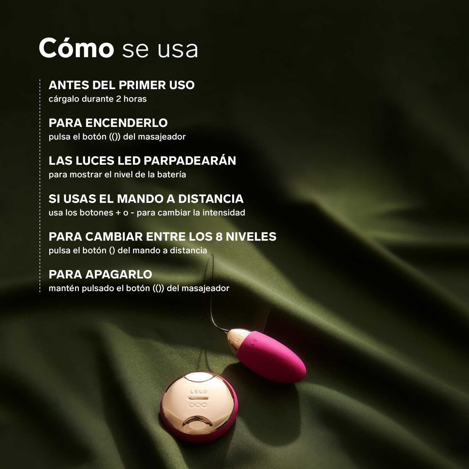 - Ocho Modos de Placer: Variedad de intensidades que puedes manejar con el control remoto.